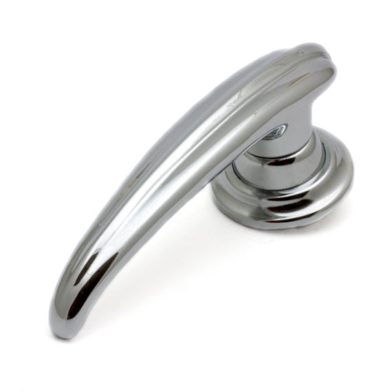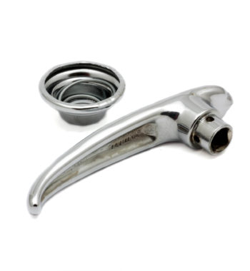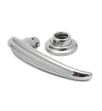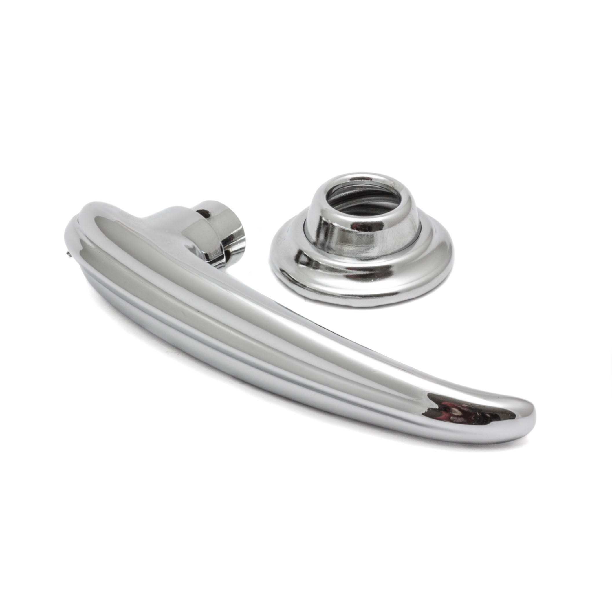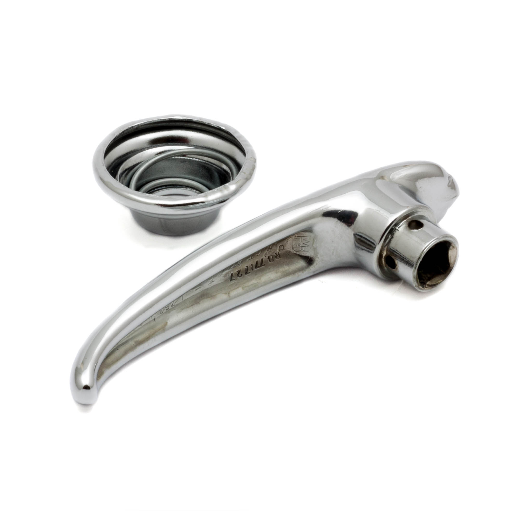 Interiérová klika pro veterány, pochromovaný kov. Délka kliky 115mm, průměr příruby 40mm.