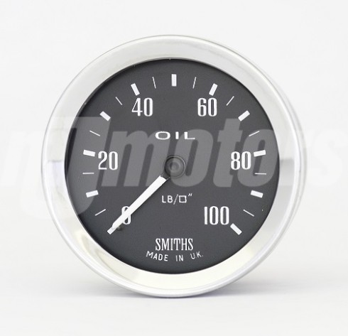Mechanický tlak oleje SMITHS. Rozsah 0-100 psi. Série Classic. Průměr 52mm. Možnost volby rámečku přístroje ( 1/2 „V“ a 1/2 kulatý ). Série přístrojů Classic je pokračování výroby klasických přístrojů Smiths.