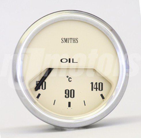 Teplota oleje SMITHS. Série Classic. Rozsah 50-140°C. Průměr 52mm. Možnost volby rámečku přístroje ( 1/2 „V“ a 1/2 kulatý ). Série přístrojů Classic je pokračování výroby klasických přístrojů Smiths.