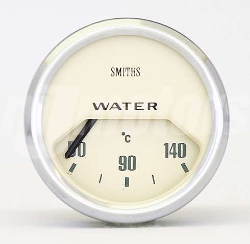 Teplota vody SMITHS. Série Classic. Rozsah 50-140°C. Průměr 52mm. Možnost volby rámečku přístroje ( 1/2 „V“ a 1/2 kulatý ). Série přístrojů Classic je pokračování výroby klasických přístrojů Smiths.